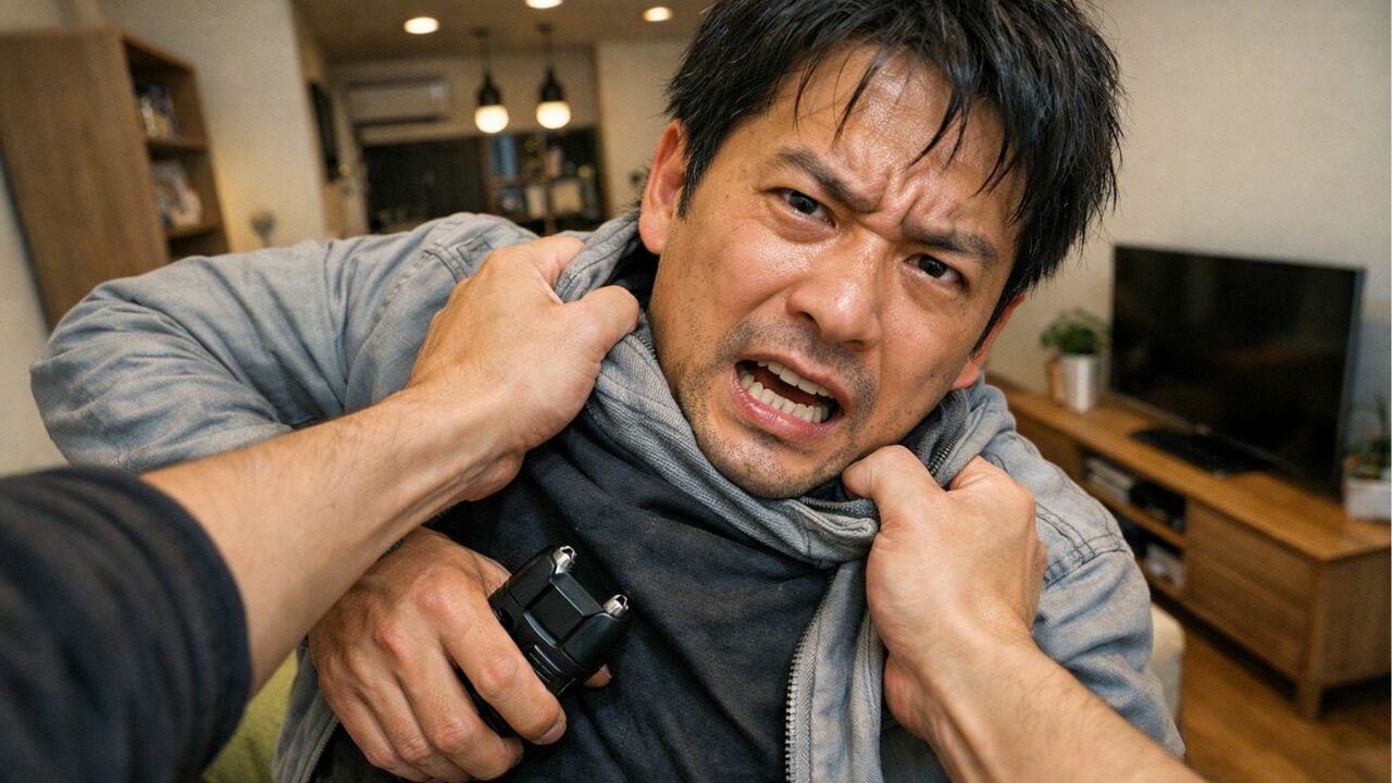 あれは何だ? ガタガタ震えながら、力を絞り出して近づき、チェーンの先を見ると横に置いたカバンの取っ手と繋がっている。手を伸ばしてチェーンを触った途端、手の震えが伝わりチャリ! チャリ!と音がし、びっくりして直ぐ手を離した。