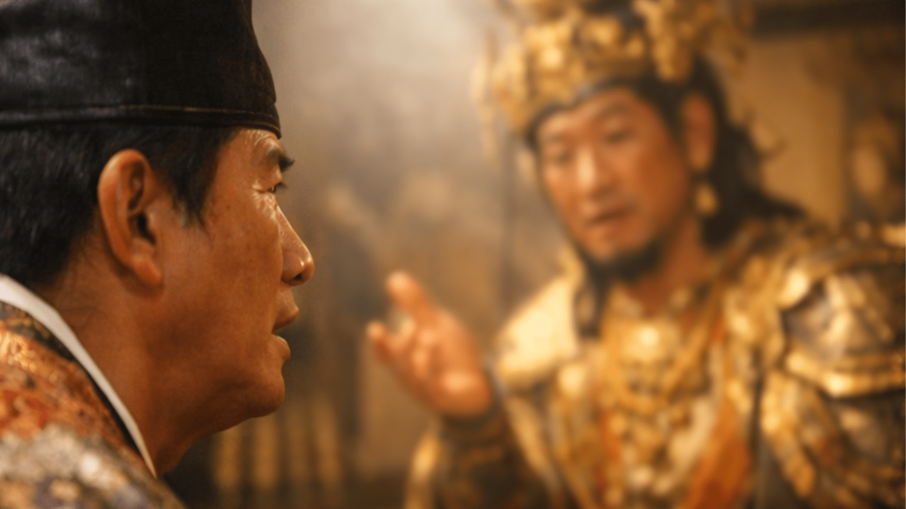 弁財天はその美しさに着想を得て、琵琶(びわ)を奏で始めた。その音色はやさしくも哀愁を帯びており、十五童子の中には落涙する者もいた。