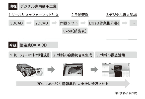 ものづくりに関わる情報を設計の基幹モデルである3Dモデルに集約し、それを全社に流通させ、各部門でそのデータに価値を付加し、徹底的に活用してはどうだろう。それが実現できれば「製造業DX×3D」と呼べる(図2-4の下部)。