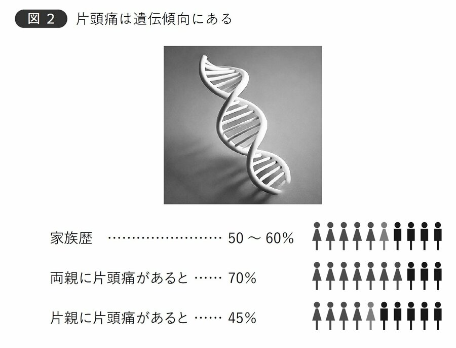 片頭痛は50~60%に家族歴が認められます。両親に片頭痛があると70%、片親の場合は45%に片頭痛が遺伝するといわれています。