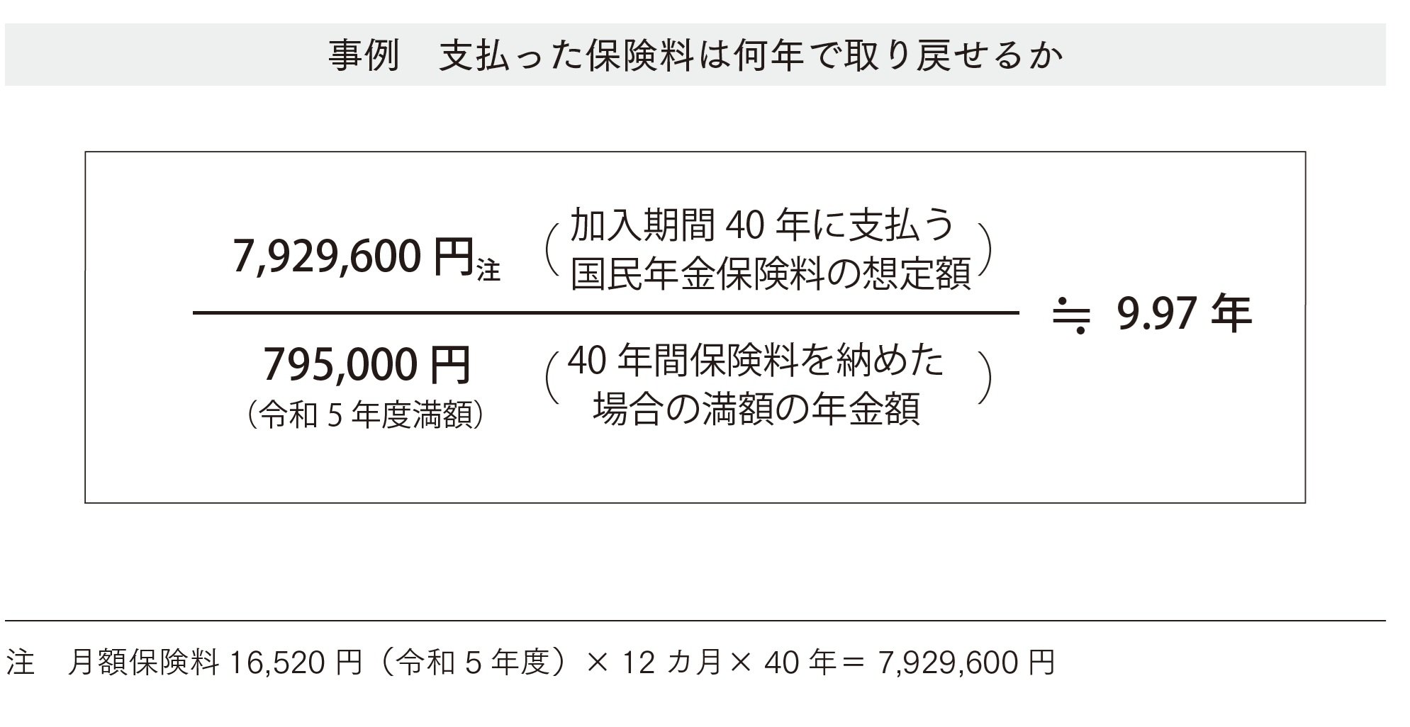 事例で支払った保険料は何年で取り戻せるかは、支払い保険料を受け取り年金額で割って計算した場合の約9.97年となります。老齢基礎年金を10年受給すると、支払った国民年金保険料をすべて回収でき、支払い保険料を上回ります。