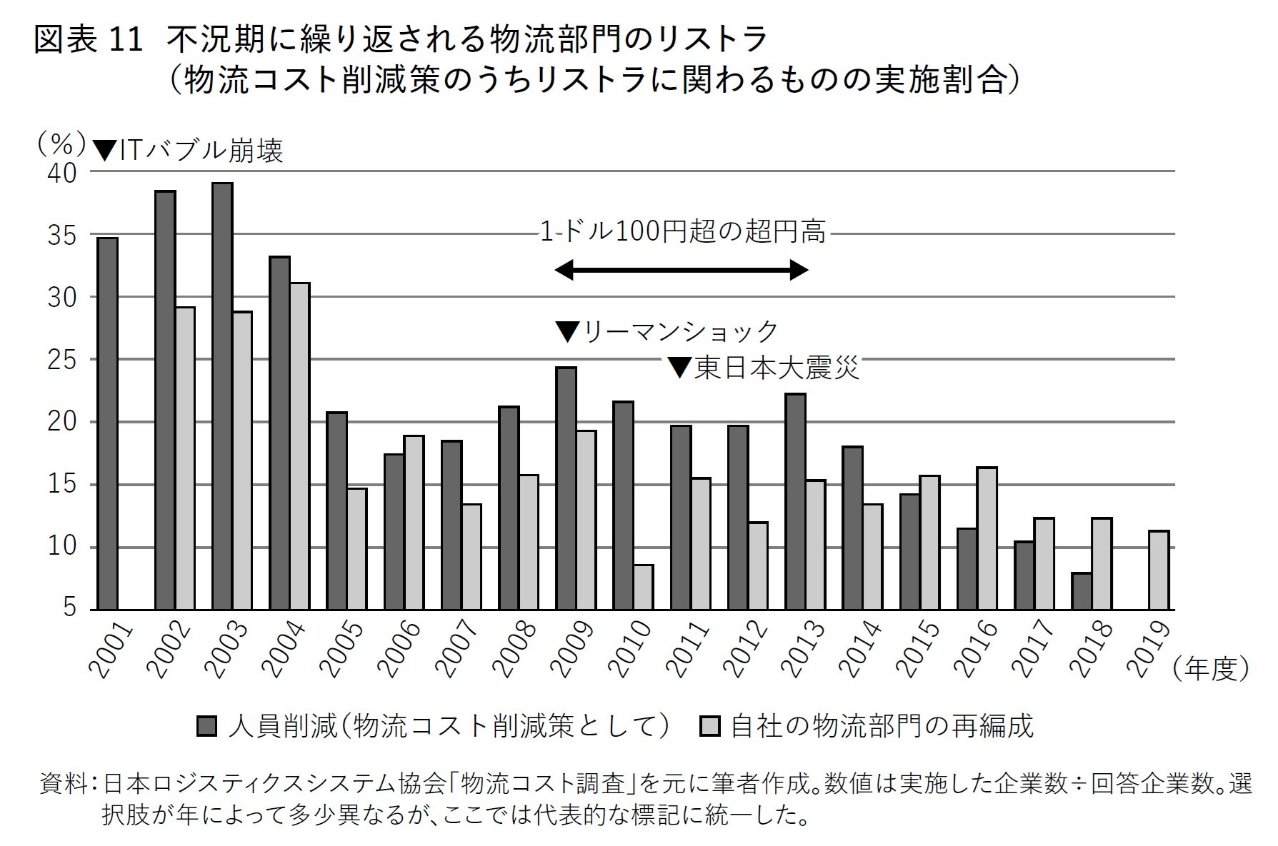 「人員削減」が増えるのは当然とも言えるが、同時に「物流部門の再編成」も増えていることが分かる。「物流部門の再編成」の具体的な中身は物流子会社売却を含むリストラである。このような結果からも、不況が生じるたびに物流がリストラの対象となってきた事実を確認することができるのである。