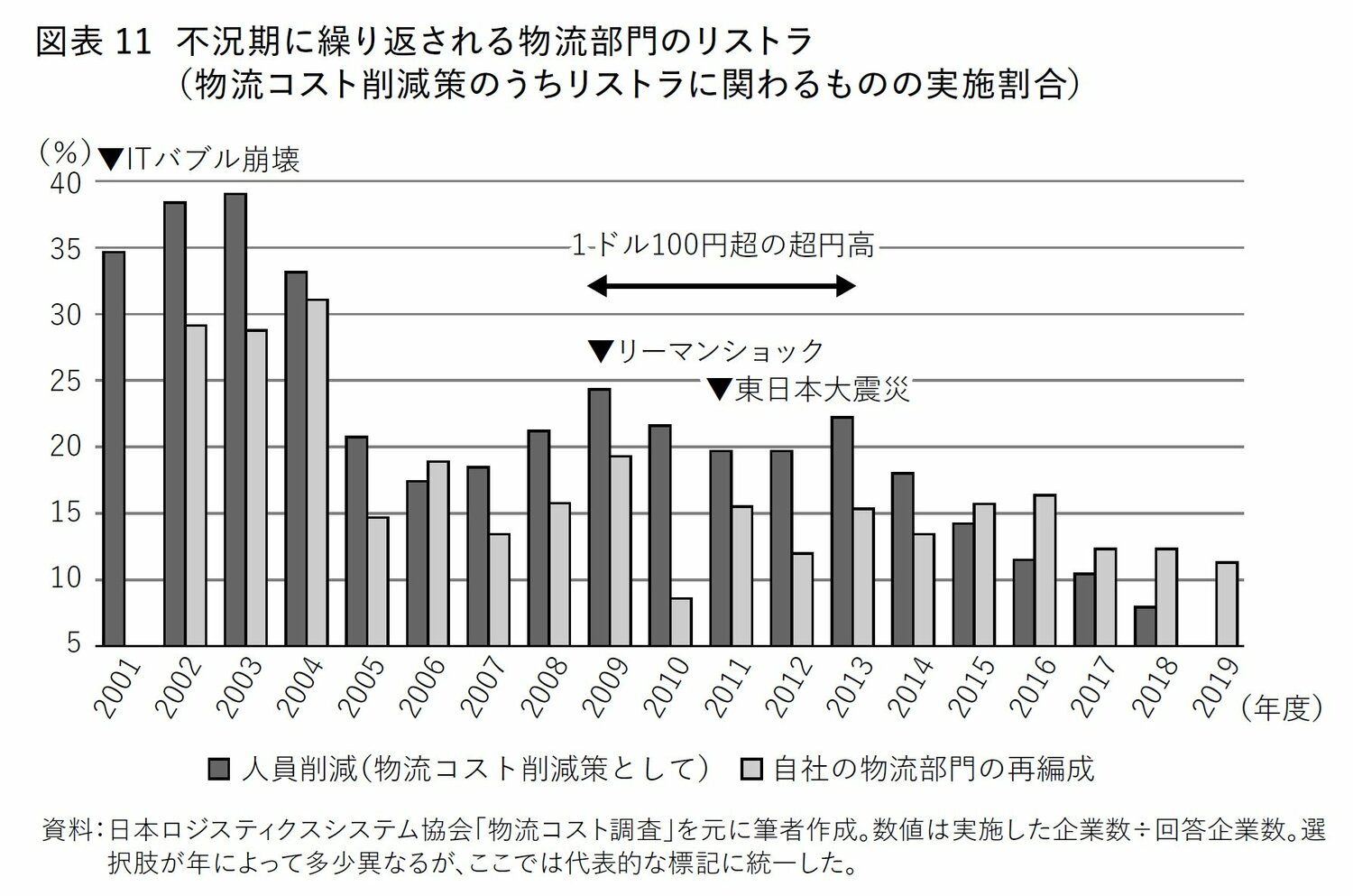 このように振り返ってみると、2000年以降の日本企業(特に輸出企業)は一貫して極めて厳しい環境に置かれていたことが分かる。そしてこの間、多くの輸出企業は業績悪化によって余剰人員と過剰負債を抱えることになり、その重荷に耐えかねた企業は、リストラを余儀なくされたのである。
