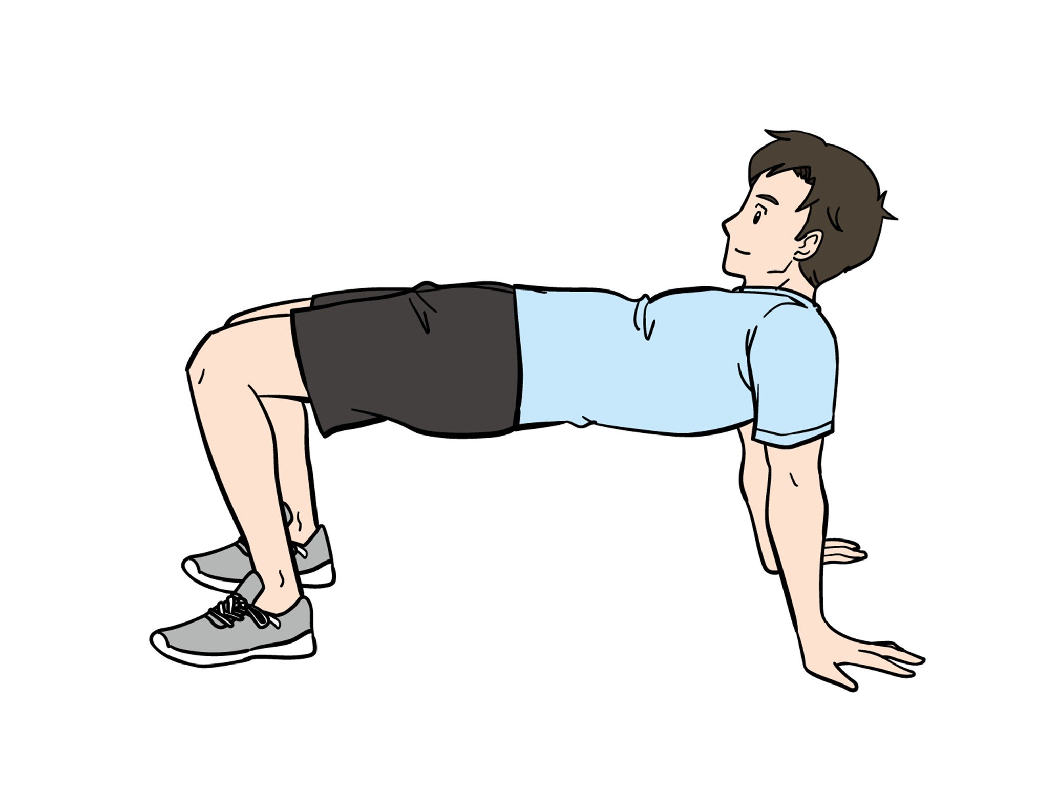 ③体幹部が床と平行になるまで臀部の位置を上げて、その体勢を維持する。
