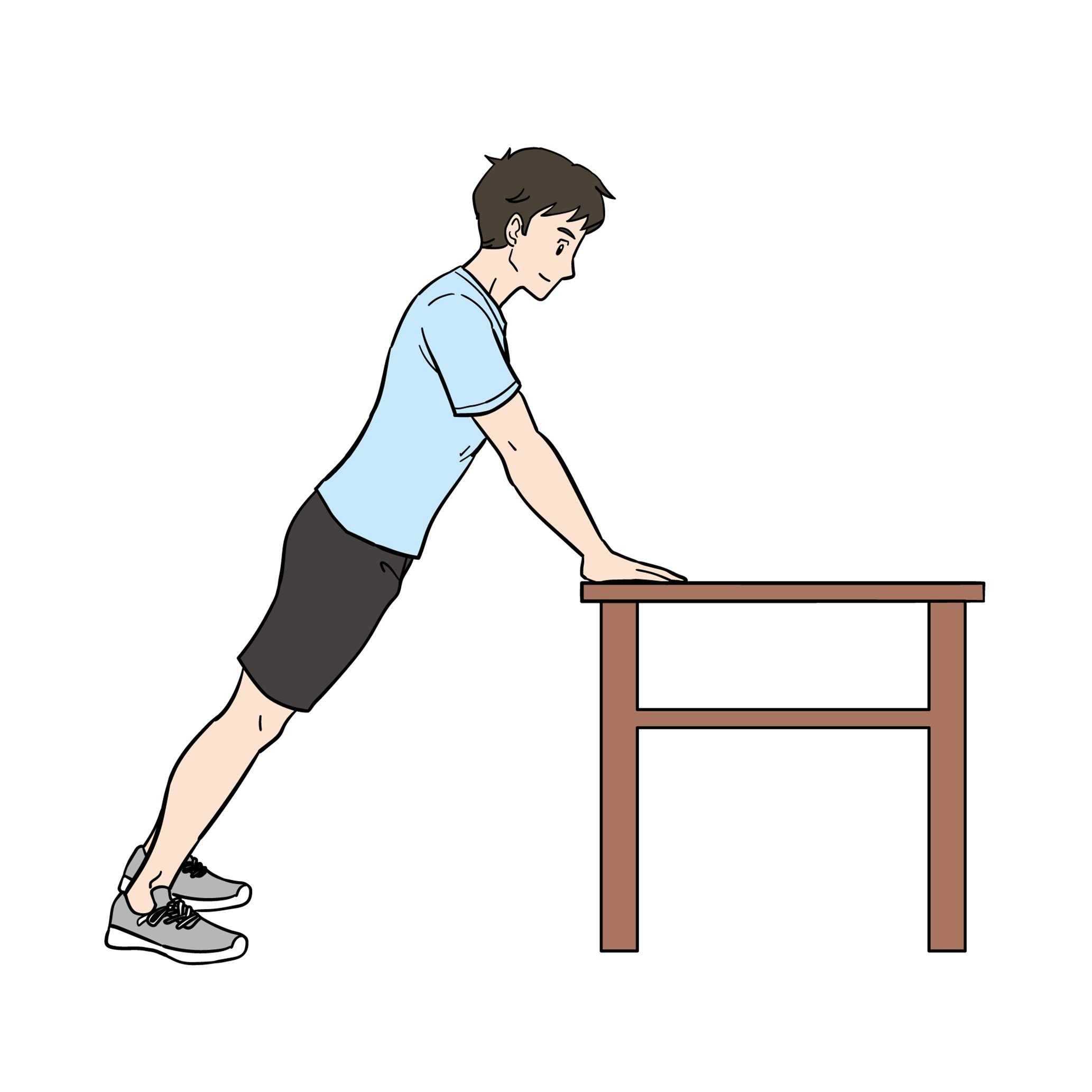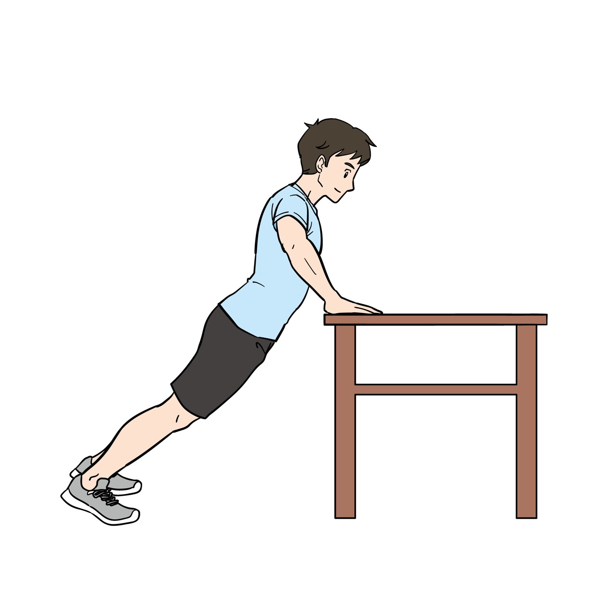 まずは手の付く位置を高くして難易度を下げた「デスクプッシュアップ」で押す動作に慣れよう。動作中に机が動くと危ないので、必ず壁に付けるなどして机を動かないように固定する。