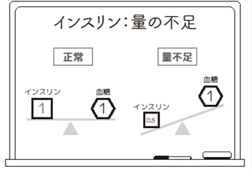 M: そのとおりです。例えば、インスリンと血糖値が1:1で釣り合うのを正常としたときに、インスリンが0.5しかなくて(量が足りなくて)血糖値が上がってしまうイメージです(図8)。