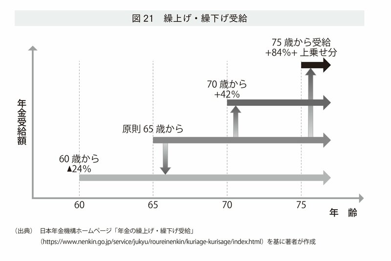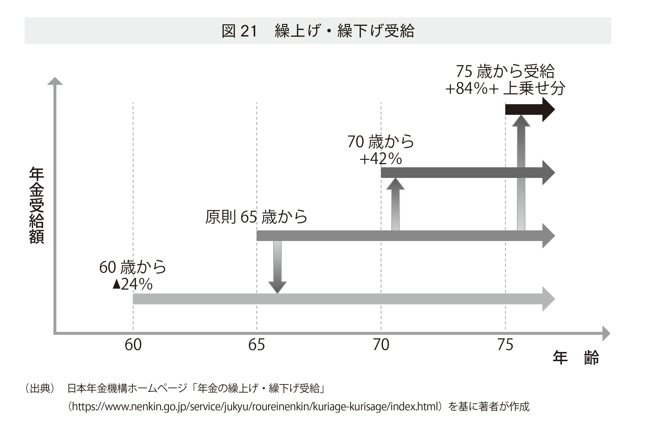図21のように、老齢基礎年金、老齢厚生年金ともに繰下げ受給をした時点から、5年間で42%、10年間で84%年金額を増額できます。