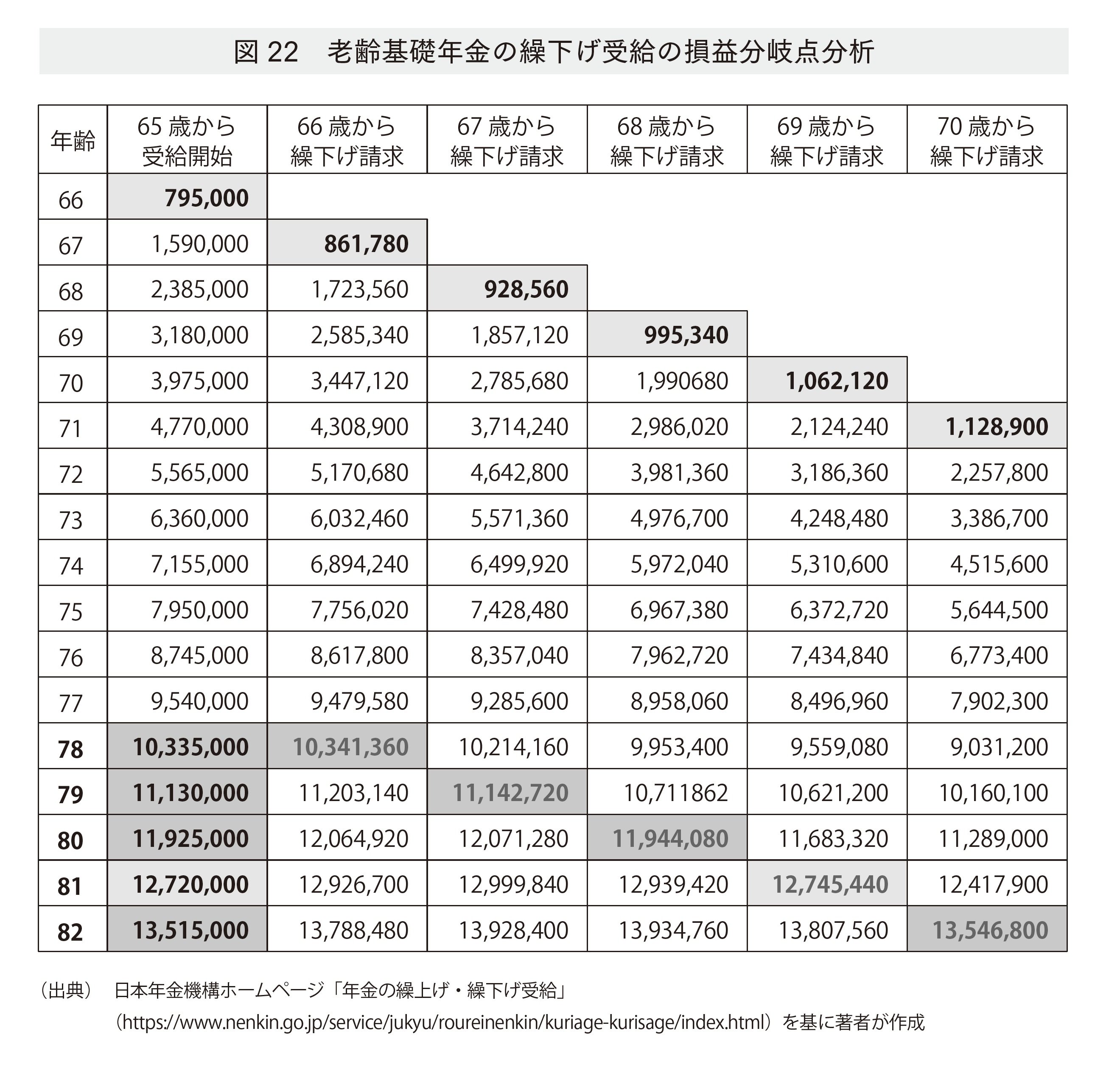 老齢基礎年金は、加入者の受給額の計算が、加入期間に従って同じなので、老齢基礎年金のみを繰下げ受給した場合で、損益分岐点を分析します。図22では、何歳になるまで繰下げた年金を受給できれば、受給総額として得になるのかという損益分岐点を表にしてみました。