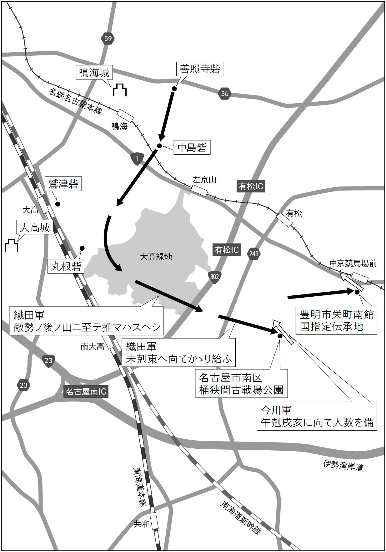 今川本陣が大高方面ではなく鳴海方面に向かったとするならば、その進路は、