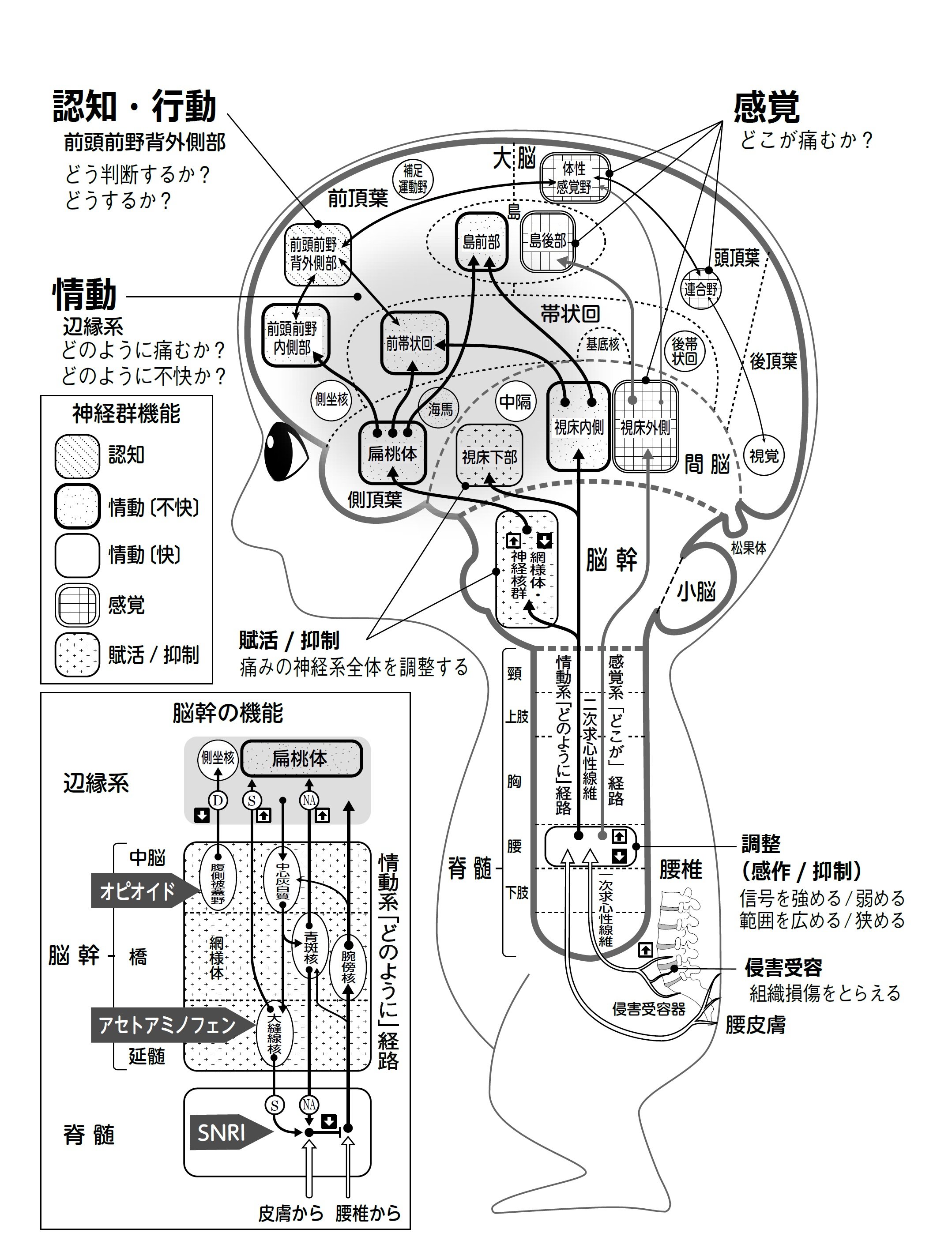 前帯状回と島は中間皮質に分類されます。前帯状回と島前部は痛みの情動処理を担当する《古参部長》であり、島後部は痛みの空間処理を担当する《古参部長》です。腰痛の場合はおもに島《部長》が空間処理に当たっているようです。