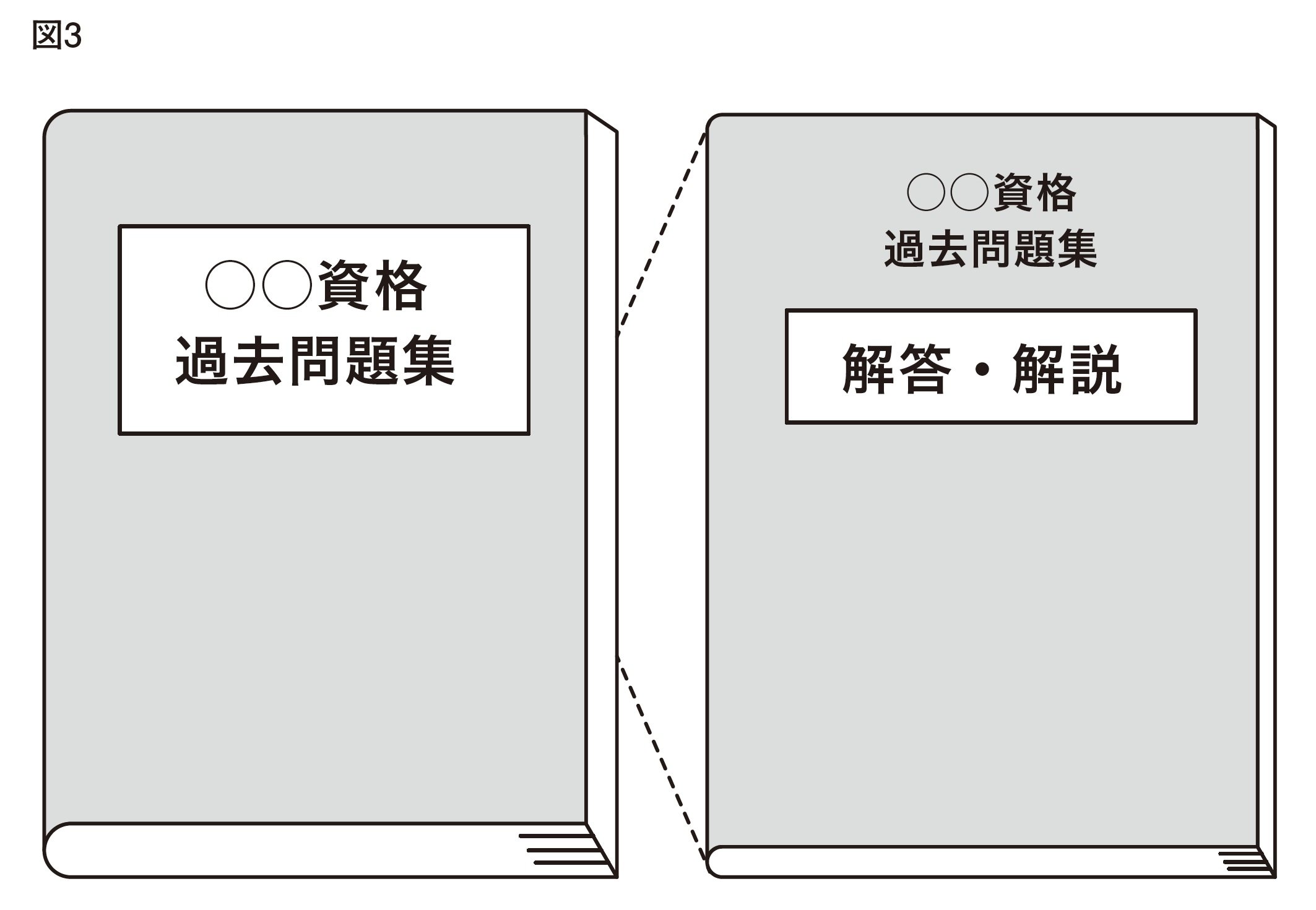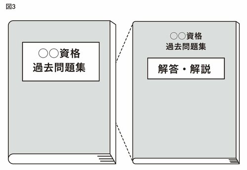 もしこのような過去問がない場合は、前のページに分野別の過去問、後のページに解答・解説がまとめて書かれているものでもよい。この場合、過去問を購入後すぐに問題と解答・解説を分離すれば、問題と解答・解説とが見比べやすくなる。(図3)