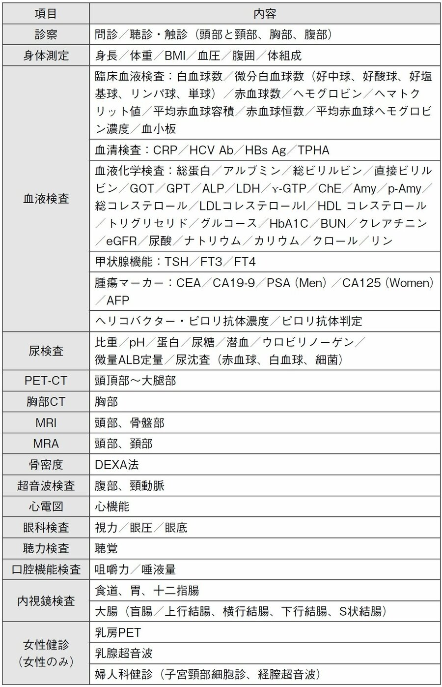 次の表は当院にて実施している基本的なCheck項目の一覧となります。こちらに加えて、特殊体質やがん家系などの方にはオプションも提供しています。