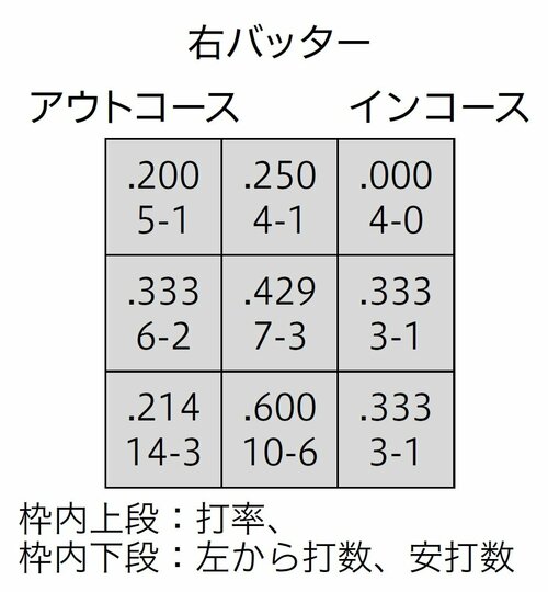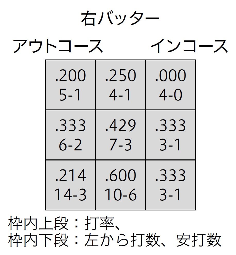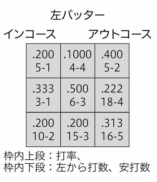 アウトコースの「トータル」の被打率は・240、インコースの「トータル」の被打率は・200となっています。幅の角度をつけるボールを投げることができる「コース」の被打率は低めにはなっていると考えます。