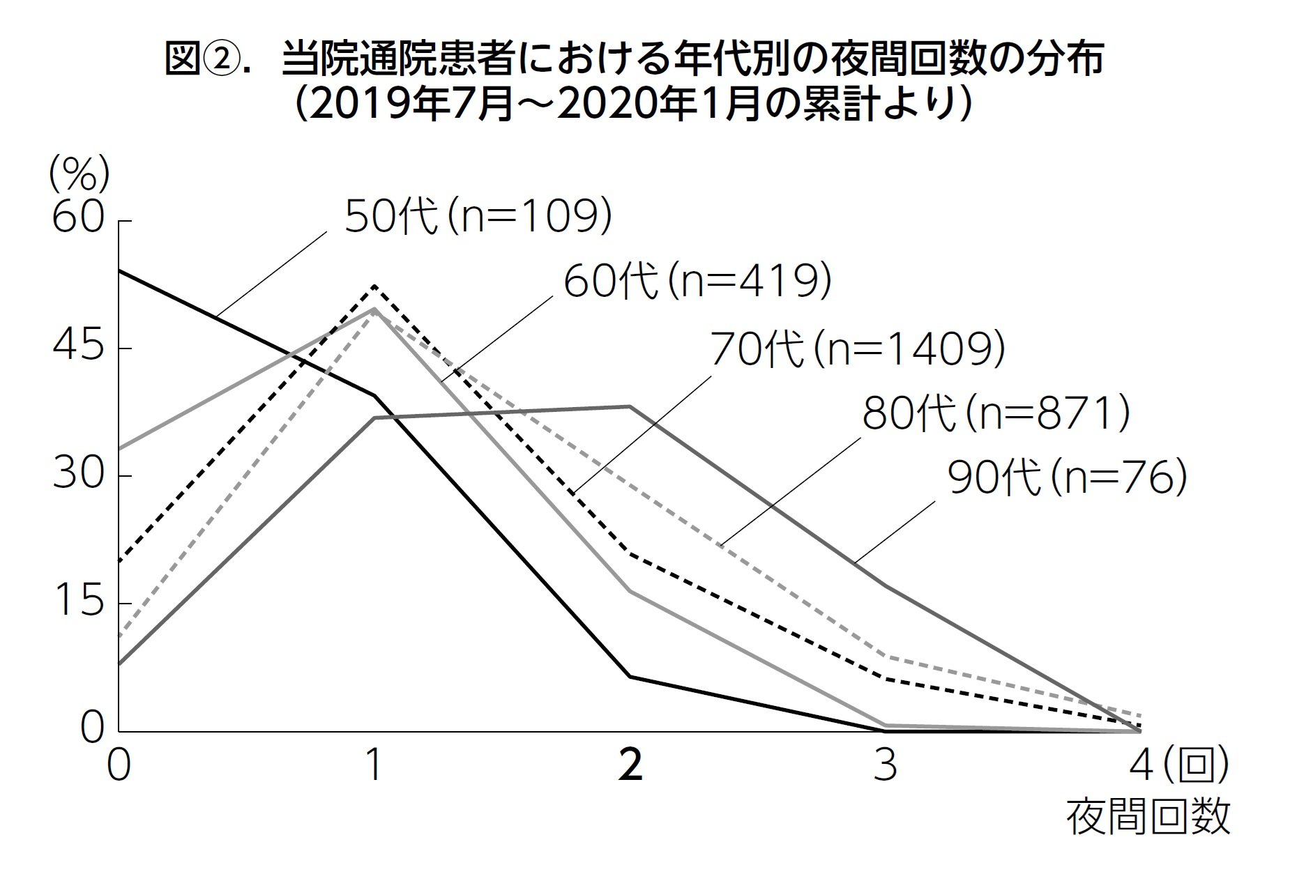 図②は、当院に通院治療中である該当患者さんを年代別に分類し、それぞれの夜間排尿回数の割合を示したものです。