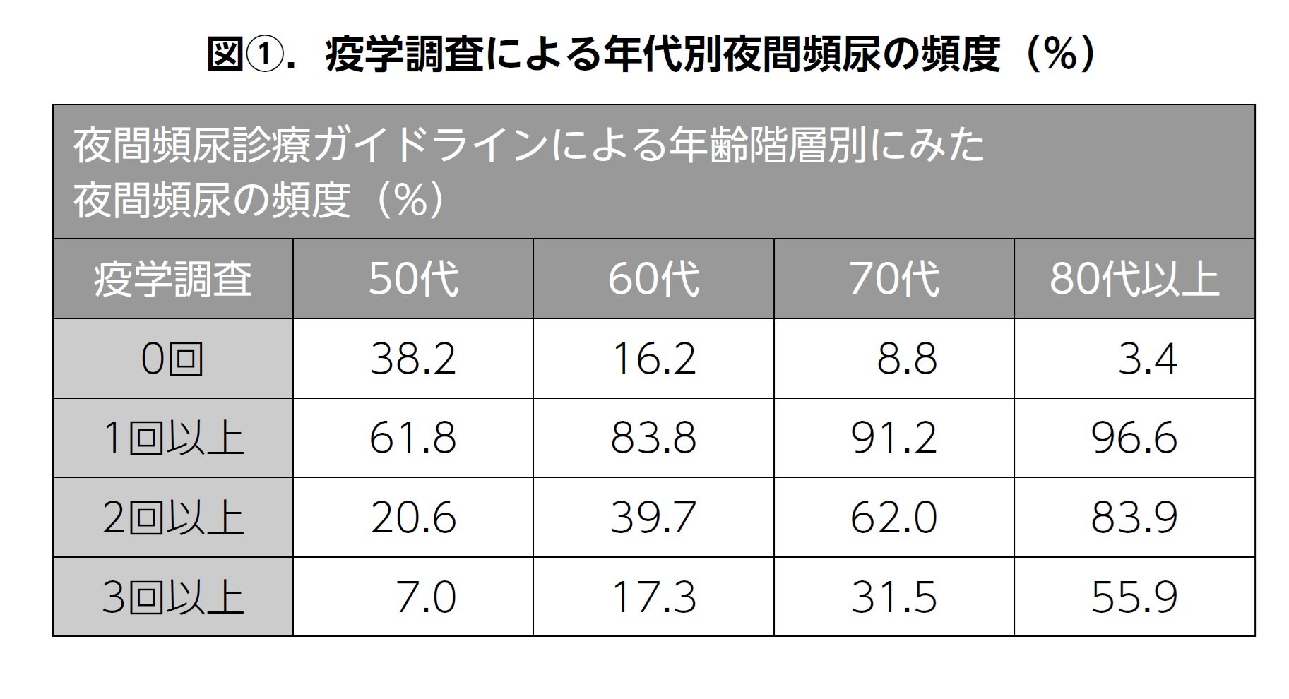 また、活動量や体力、気力が年代とともに減少することが夜間頻尿の増加に関係していると考えられます。さらに、一般的な夜間頻尿の疫学調査(図①)でも、年代が上がるほど夜間頻尿回数が増える傾向が確認されています。