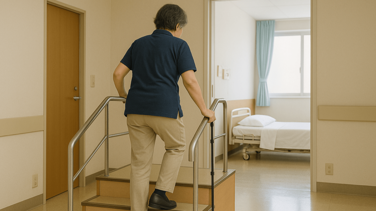 リハビリ室のフラットな床は、療法士に見守っていただきながら、杖を使ってゆっくりと歩くことができるようになっていた。一時帰宅を控えていたこともあり、階段練習を行うことに。