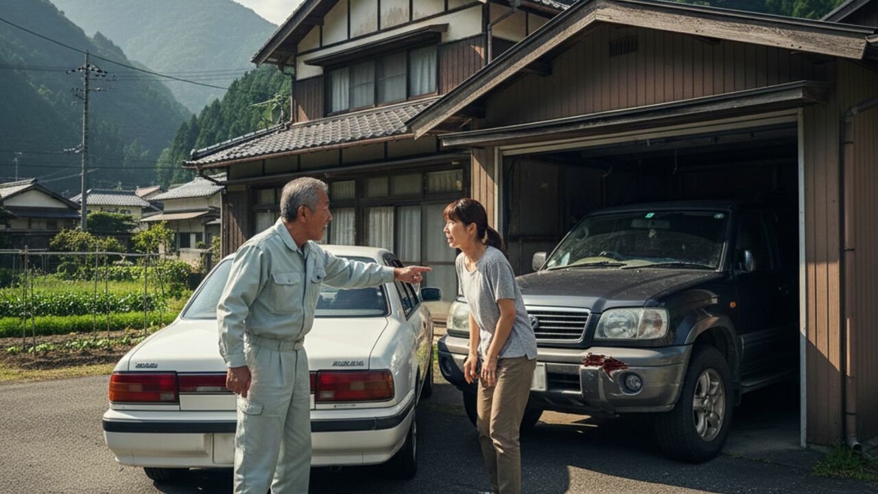 敷地内の車庫には一台しか車が入らないので澄子の車や結里亜の車は車庫の前に止めている。バックで車を止めるので貫一と澄子は車を壁にぶつけることが時々あった。