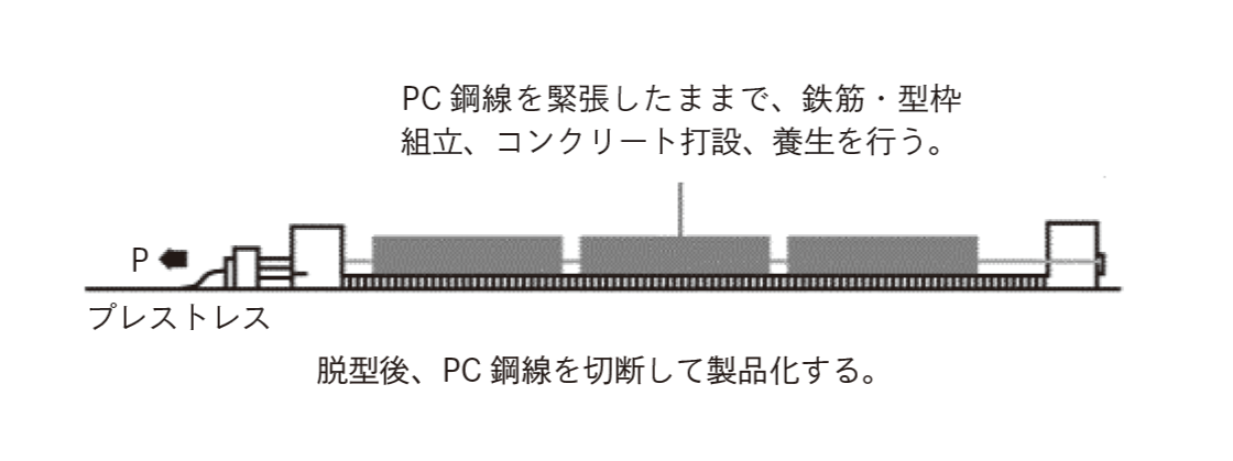 本方式が導入された当初は,鉄道の枕木などに直径2 .9 mmのPC鋼線を直線的に配置し,製造する方法が採用された.近年は,技術開発の進展に伴い,大型部材への適用が可能となり,直径12 .7 mm,15 .2 mmといった太径のPC鋼より線も使用されるようになった.