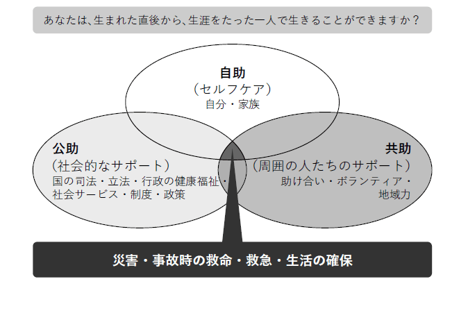 地球環境のなかの日本の風土において、人間は一人ひとりの一生(ライフサイクル)の過程で、自助(= 他人に頼らず、自力で向上発展をはかること)のできない困難な時期を持つ社会的存在です。