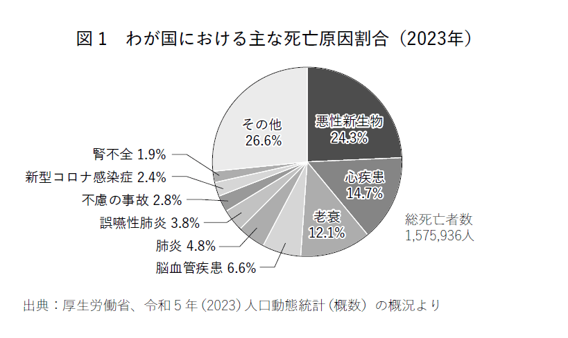 令和5年の人口動態統計月報年計(概数)の概況(参考資料二)によると、全死亡者数は157万5936人で、その内訳を見ると、1番はがん(悪性新生物)で全死亡者に占める割合は24・3%、2番は心疾患の14・7%、3番は老衰で12・1%となっている(図1)。