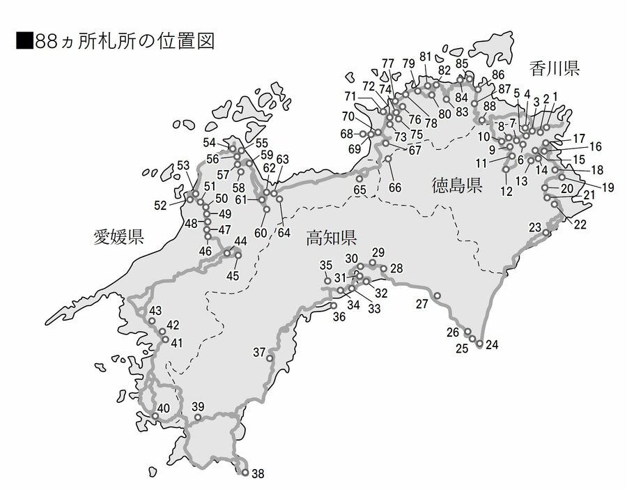 徳島県(阿波の国)にある1番札所霊山寺(りょうぜんじ)から23番札所薬王寺(やくおうじ)までは、「発心」(発菩提心)修行への志をかためる区間(約240キロ)。24番札所最御崎寺(ほつみさきじ)から高知県(土佐の国)に入り、39番札所延光寺(えんこうじ)までは、自らと向き合って苦闘する「修行」区間(約430キロ)。