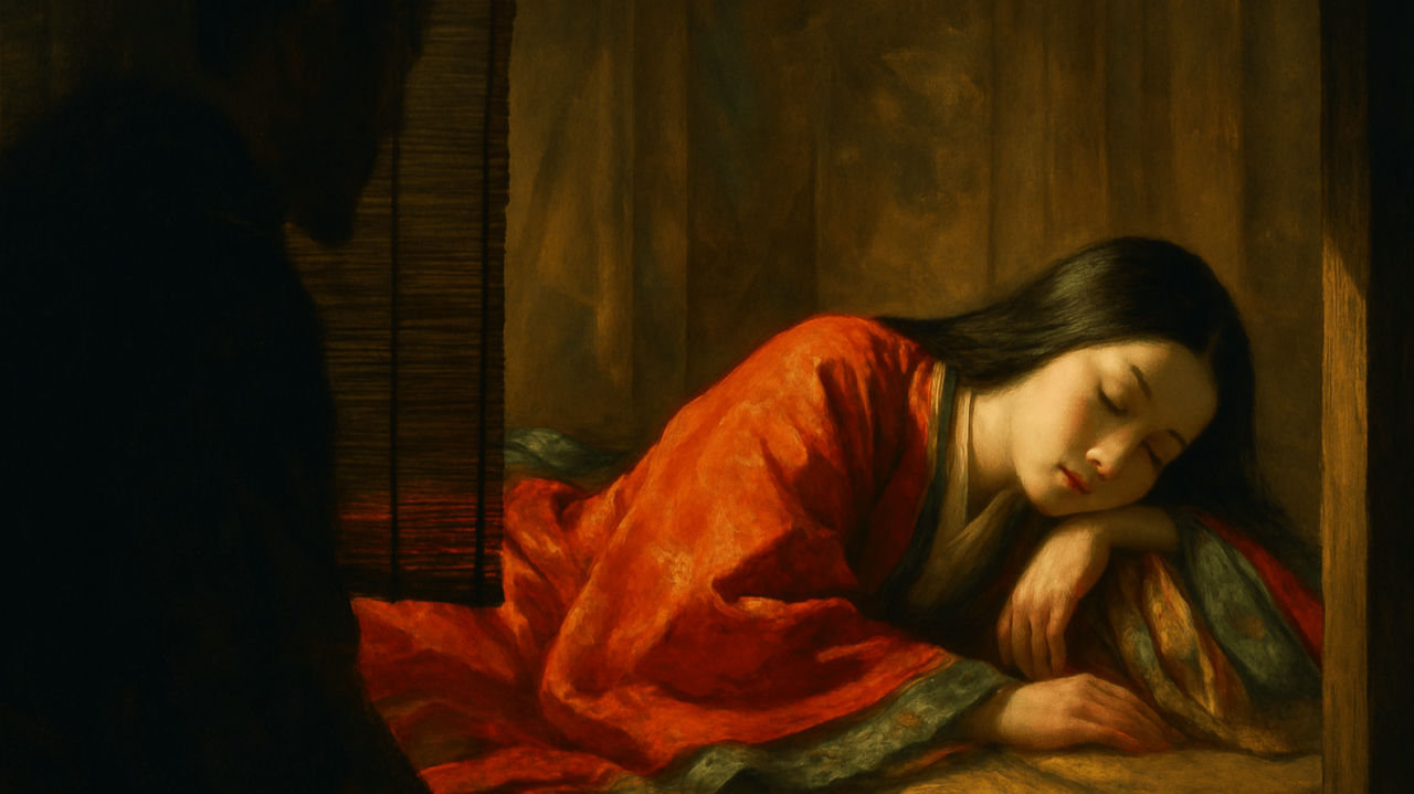 通りがかりに、宰相の君の戸口をのぞくと、昼寝をしていた。絵に描いた物語の姫君のようだったので、思わず口を覆っていた袖を引きのけて起こしてしまった。起きあがった宰相の君の顔は、日ごろから美しい人が、またこよなく美しかったという。