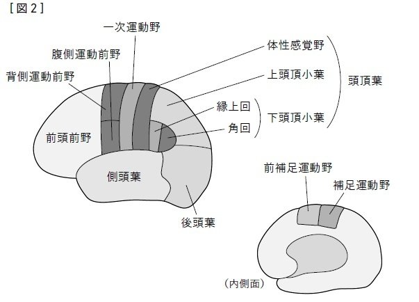 脳の領域の大きな区分として、前頭葉、頭頂葉、側頭葉、後頭葉がある(図2)。後頭葉には視覚の中枢である視覚野がある。目(網膜)から入った視覚情報は、まず後頭葉の一次視覚野に入る。その後、対象物の視覚情報のうち、それがどこにあるのかという対象物の位置や方向、動きなどの情報は、背側経路を通って頭頂葉に向かって処理される。