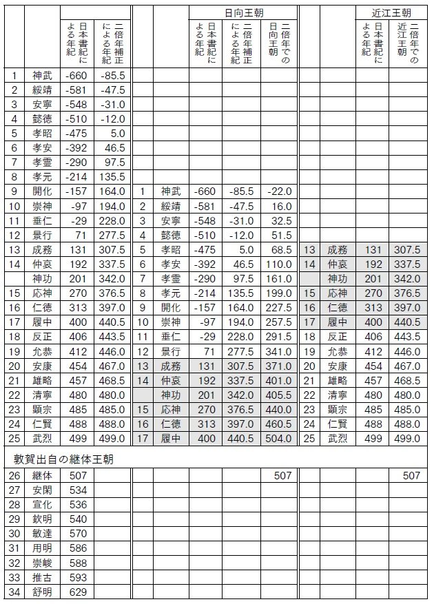 単純に計算すれば「神武天皇」の即位から「雄略天皇」の没年までの一一四〇年の半分となる。「雄略天皇」の次に即位した清寧(せいねい)天皇の即位年が庚申年とあり、西暦480年が有力である。したがって二倍年の補正により「神武天皇」即位はBC85年となり、弥生中期に対応する(表2)。「神武天皇」が日向から大和へ向かった時期がこの数値で妥当かどうかは、別の話題になる。「神武天皇の東進」については別の話題で取り上げる。