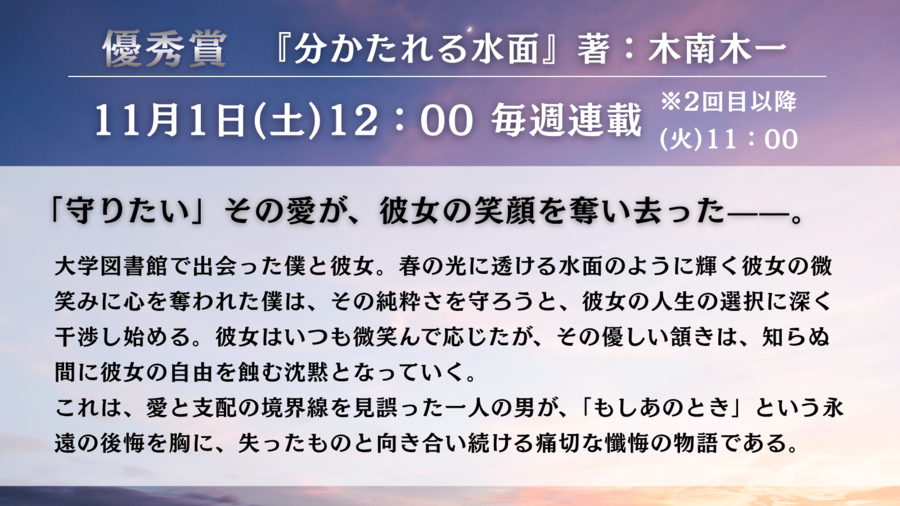 優秀賞:『分かたれる水面』 著:木南 木一 様