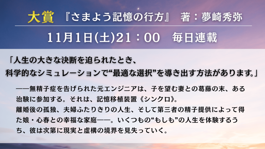 大賞:『さまよう記憶の行方』 著:夢崎秀弥 様