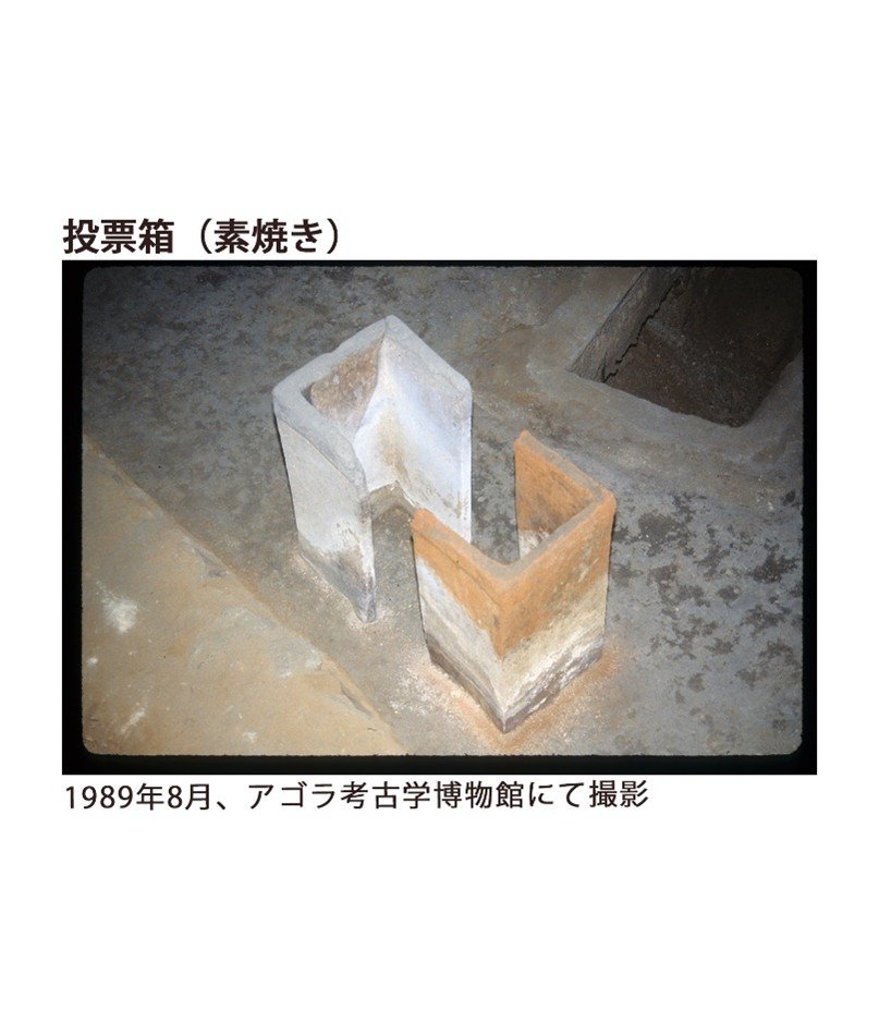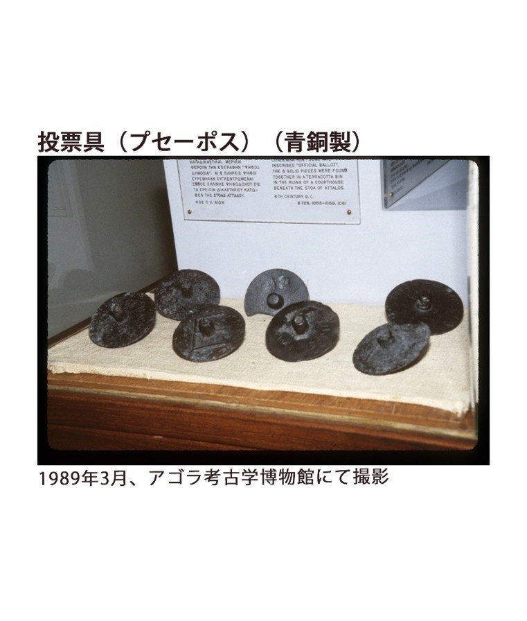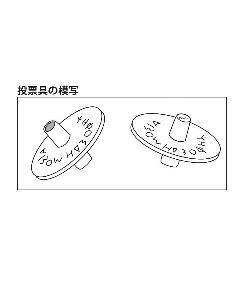 円盤面にはプセーポス・デーモシア(国有投票具)の刻印が記されています。左が有罪、右が無罪を表しています。投票具は、中央の芯が空洞(左)と中央の芯が詰まり(右)の2種類があり、投票者は芯の両端を指で押さえ、投票箱に投票しました(秘密投票)。