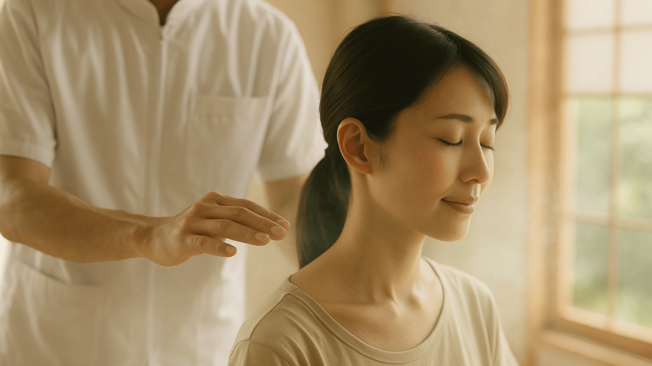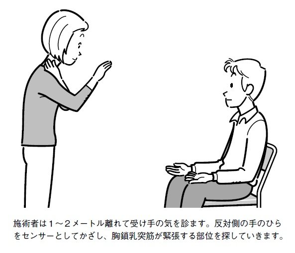 「気診」を受ける人の気の状態を診断し、適応の場所を探し、気を入れていきます。気を入れる場所は、鍼灸でいうツボを使うことが多いです。離れたところからツボに気を送り、身体を取り巻く気全体を調えます。気を入れる時間は短くて、一、二分です。