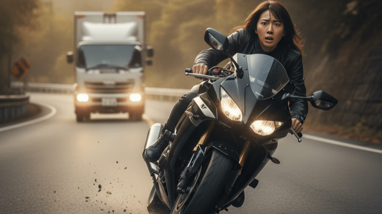 だが、後方の妻は、遅れまいと焦り、減速が足りないままコーナーへ突っ込み、反対車線にはみ出して転倒した。