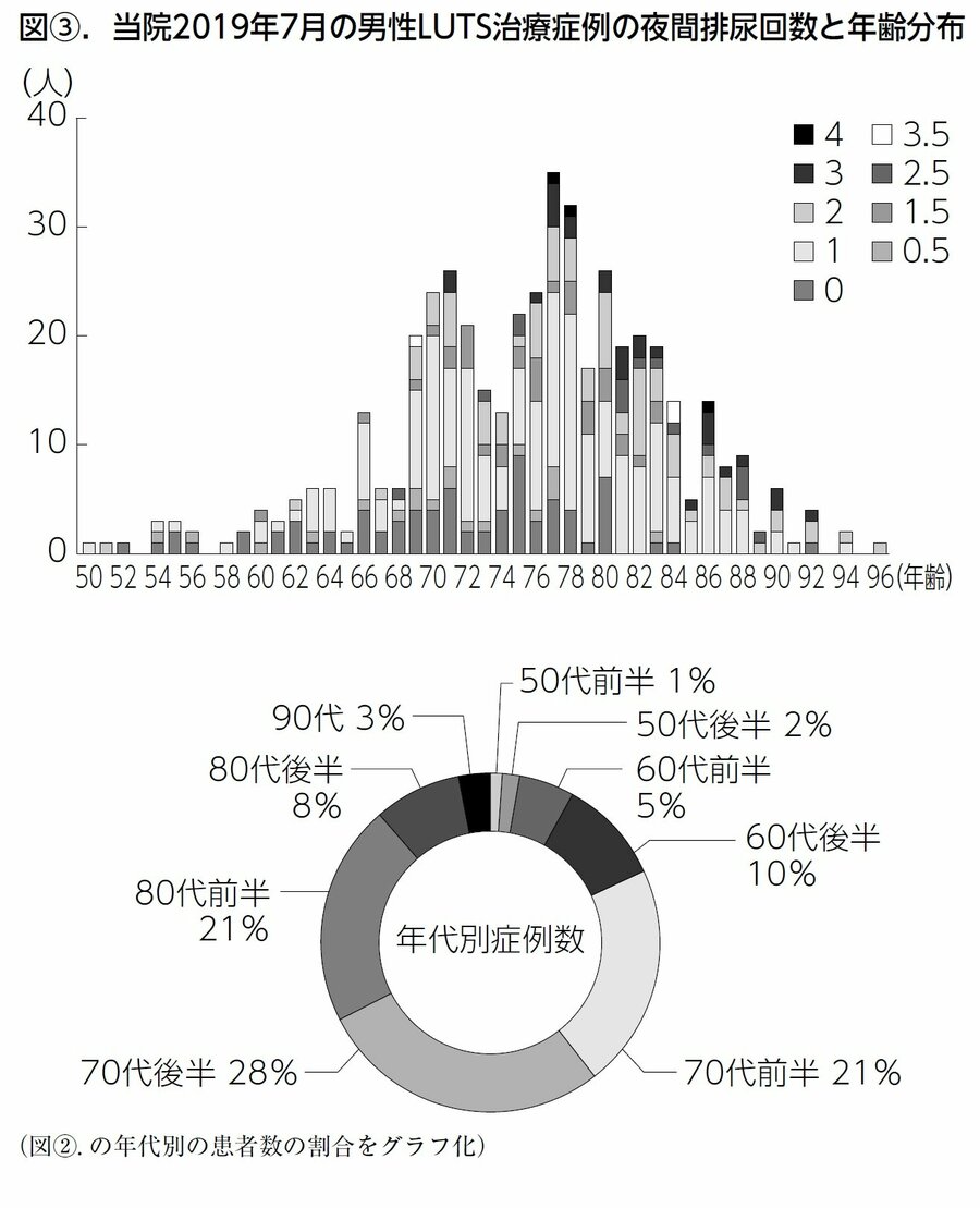 まず、少し古いデータではありますが、当院における男性LUTS治療症例の夜間排尿回数と年齢分布に関する実際をご紹介します(図③)。