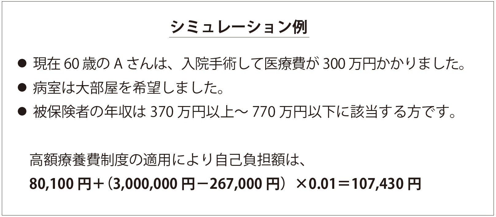 シミュレーション例では、医療費が267,000円までは、通常通りに3割を支払い、それ以上に高額になった場合は、超える額の1%分のみ負担します。