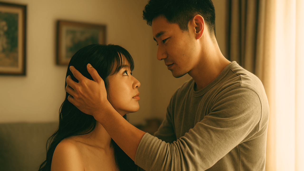 彼は私の顔に近づき、両手で私の髪を耳にかけたり、はずしたりし、髪を手ですいたり撫でたりした。私はジッとして、微笑んでいた。