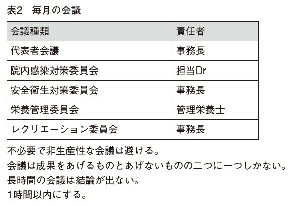 ② 「コミュニケーション」による情報の共有化の手段として、毎月おこなわれる五定例委員会(表2)と、随時の、倫理委員会、薬事委員会、輸血療法委員会、褥瘡(じょくそう)対策委員会を設置する。