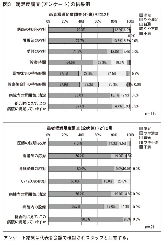 サービス提供結果の客観的な判断情報として、①品質目標の達成度。②不適合と是正処置の報告。③顧客からの苦情がある。④主観的要素が入るが毎年外来、病棟、栄養管理部、老健でアンケート調査がおこなわれる(図3)。
