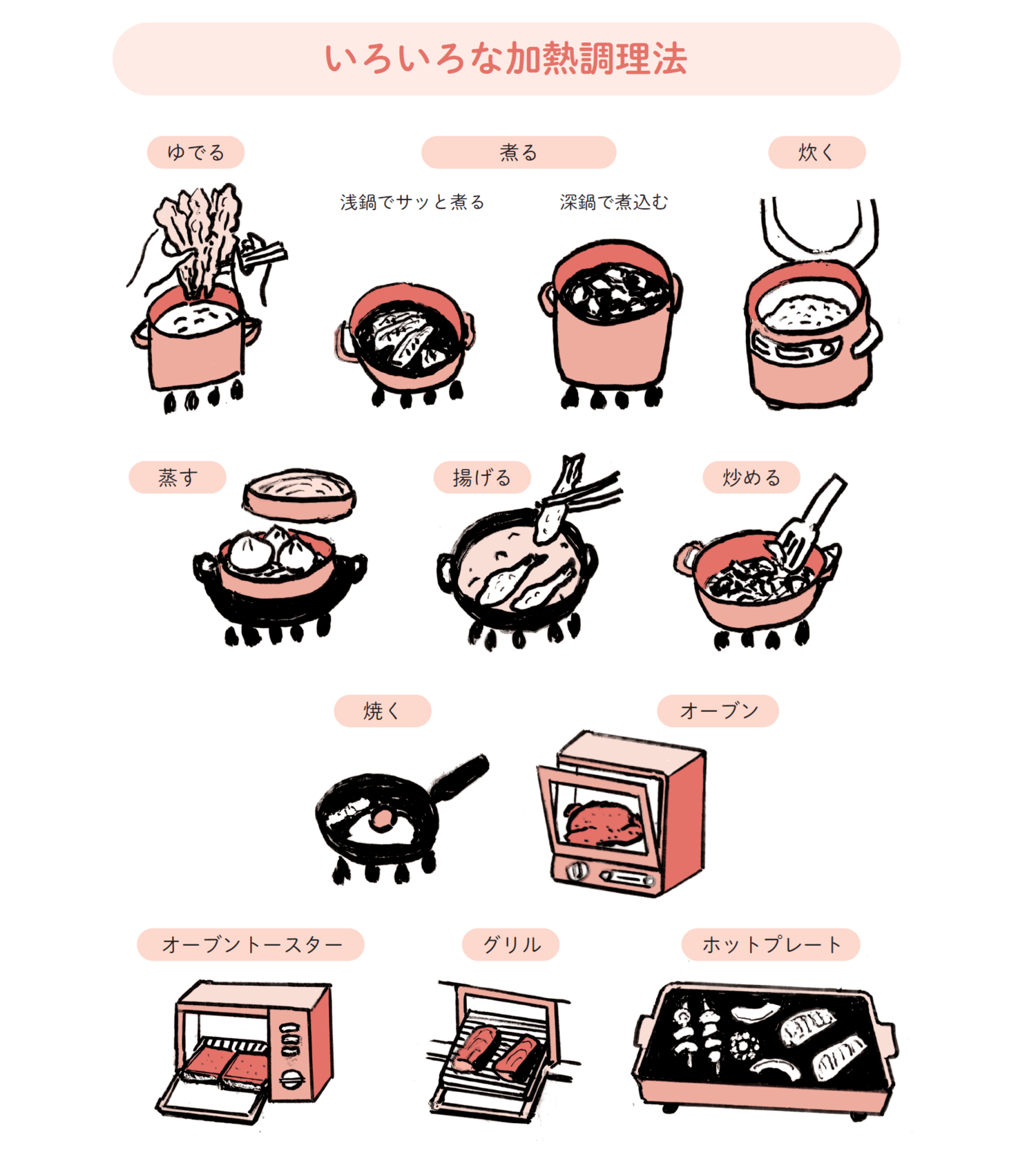 長い歴史の中で、焼く、蒸す、ゆでる、煮る、炊く、炒める、揚げるなど、さまざまな料理法が生まれました。