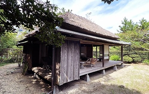 建築としてのこの庵はまことに温暖・蒸暑地らしい建物。本体の図面などは見当たらなかったけれど、八畳2間に北側以外の3方向に縁が回っている建築。屋根は茅葺きで庇(ひさし)部分が張り出している。たぶん南国的な気候で時雨(しぐれ)が多く、その対応なのだろう。茅葺きは結構重厚ですが、もちろん夏期の日射による室内気温上昇を抑制したいというのが主目的。