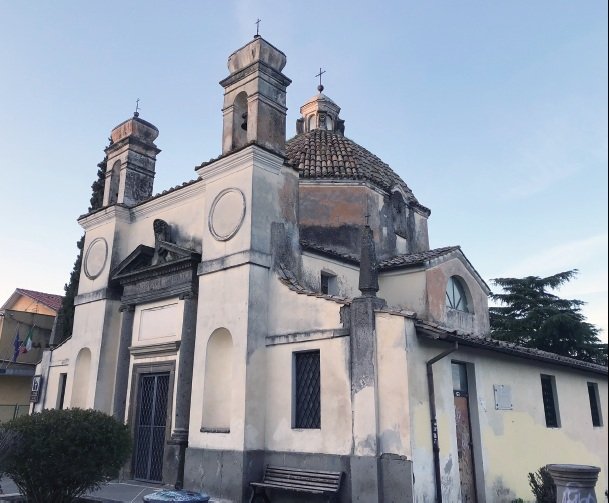 聖ジュゼッペ教会。教会はギリシャ十字型のプランで、大きな八角形のドームと2本の横長の鐘楼が特徴的。