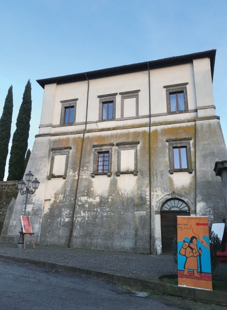 モンテローシ市役所。市役所は、大きく堂々としており、フランチジェナ街道の看板が出迎えてくれる。