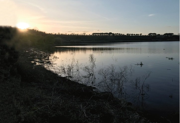 夕暮れ時のモンテローシ湖。都会の喧噪から離れた湖に夕日が静かに沈んでいく。