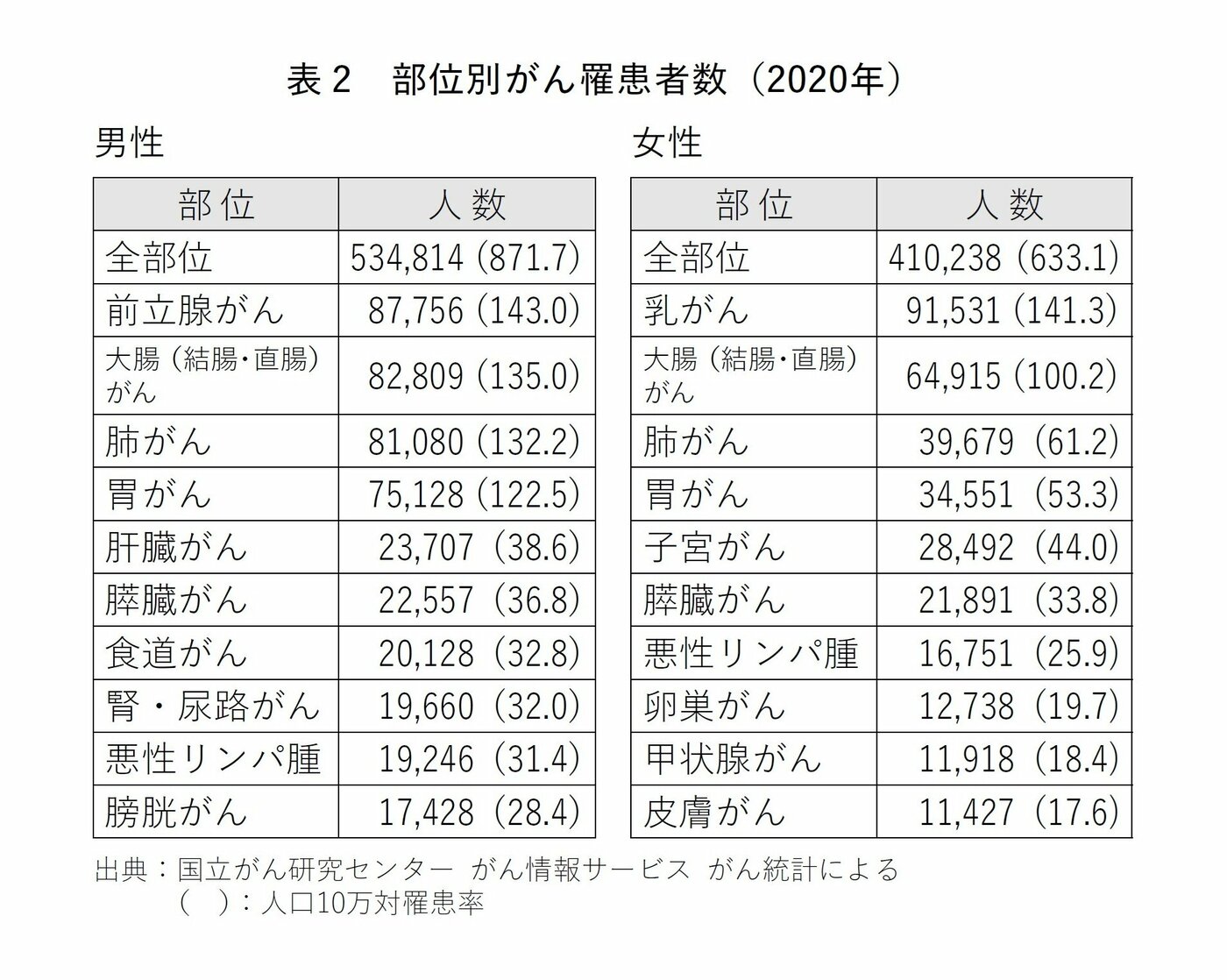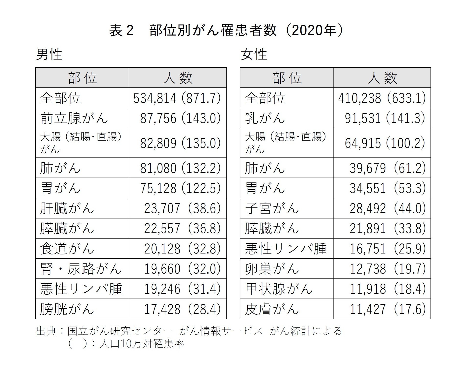 女性では、最も多いのが乳がん(91531人)、次いで大腸がん(64915人)、肺がん(39679人)、胃がん(34551人)、子宮がん(28492人)、膵臓がん(21891人)の順であった(表2)。