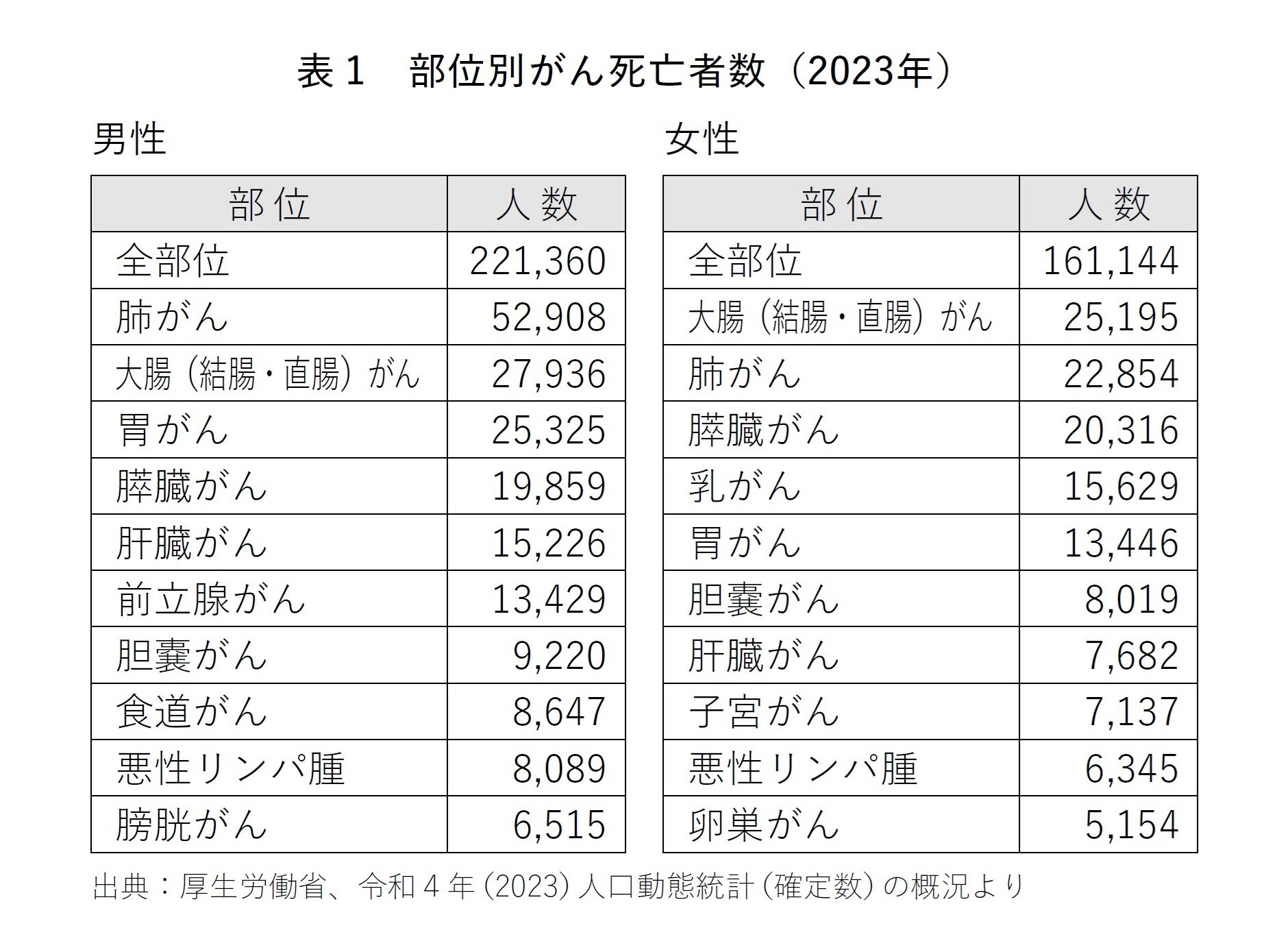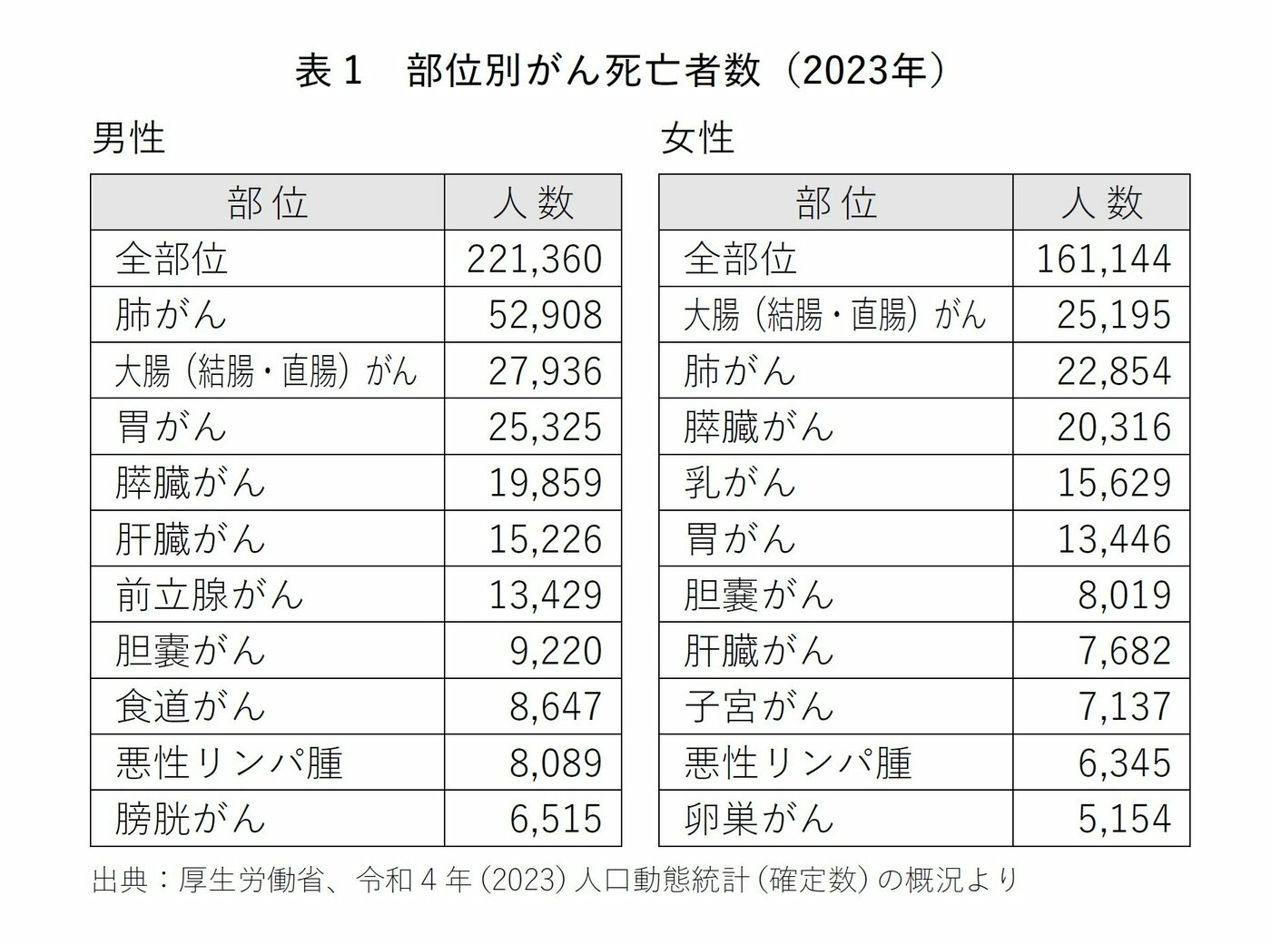 同年のがんの部位別死亡者数を見ると(参考資料三)、男性では、肺がん(52908人)が最も多く、大腸がん(27936人)、胃がん(25325人)、膵臓がん(19859人)、肝臓がん(15226人)の順で、女性では、大腸がん(25195人)、肺がん(22854人)、膵臓がん(20316人)、乳がん(15629人)、胃がん(13446人)の順になっている(表1)。