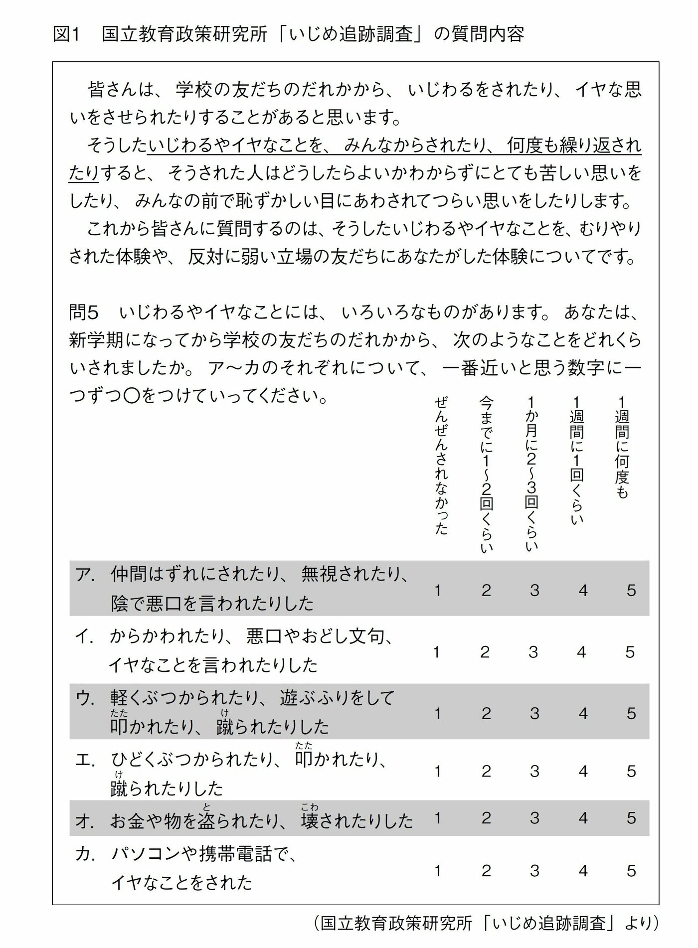 写真を拡大 図1 国立教育政策研究所「いじめ追跡調査」の質問内容