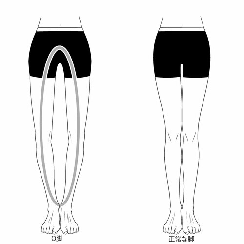 O脚とは、立って足をそろえたとき、両方の内くるぶしがついているのに膝の内側が接触しない状態のことで、その見た目がアルファベットのOに見えることからO脚と言われます。