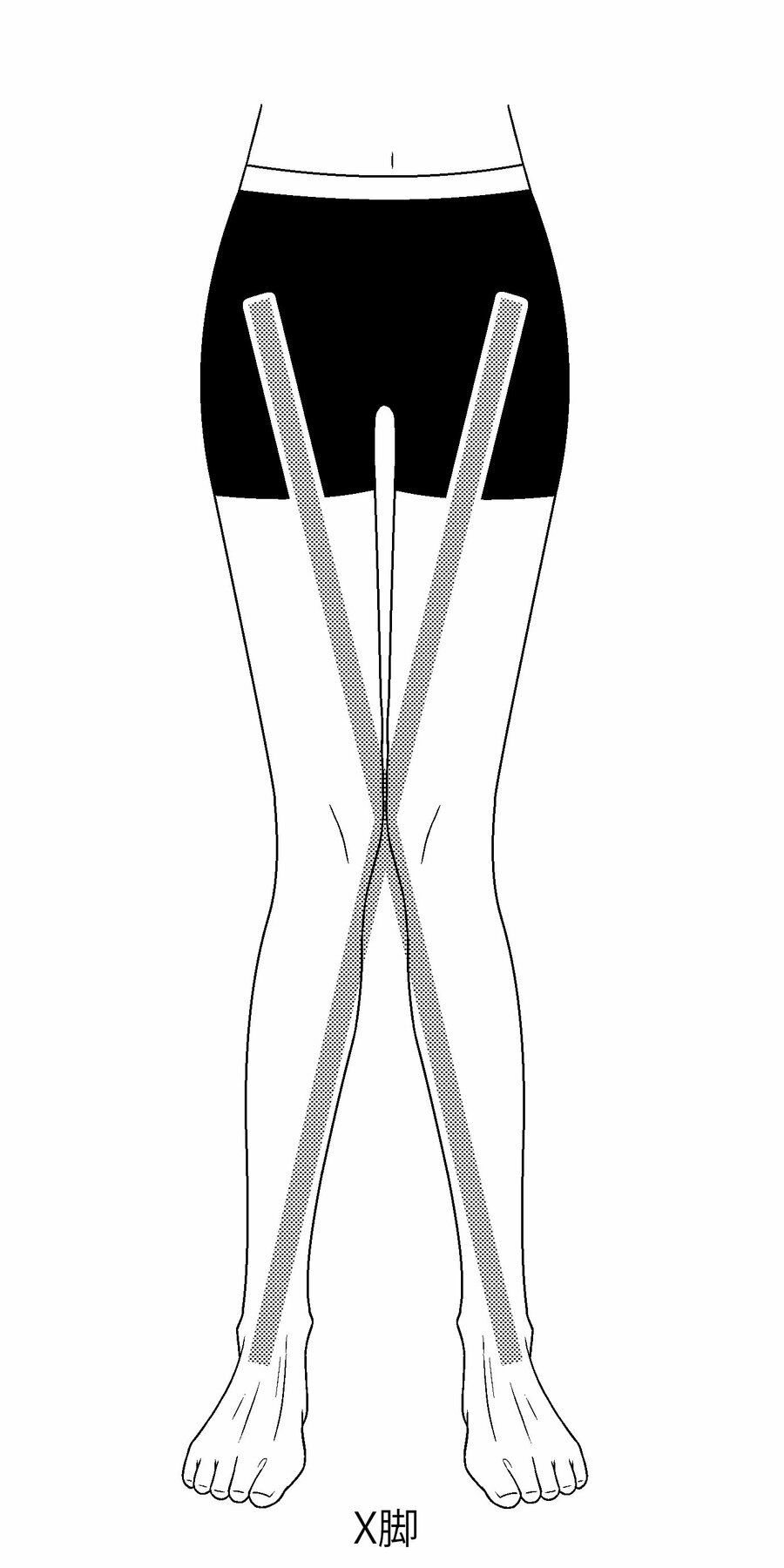 膝をそろえたときに、足首がくっつかず開いてしまう状態になることをX脚といいます。