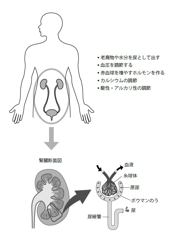 腎臓は人の拳(こぶし)ほどの大きさで、背中の左右に1つずつあります。主な仕事は血液をろ過して尿を作ることです。腎臓には「糸球体」と呼ばれる血液をろ過する装置が約100万個あり、ここで血液中の老廃物や水分をろ過して尿のもとになる原尿を作ります(19ページの図)。