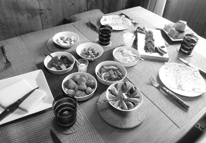 スイスの一般的な夕食は、ワインにパンとチーズ、それに干し肉(Bündnerfleisch:ビュンドナーフライッシュ)やサラダといった、シンプルな食事が多いです。どちらかというとお昼の方がメインです。